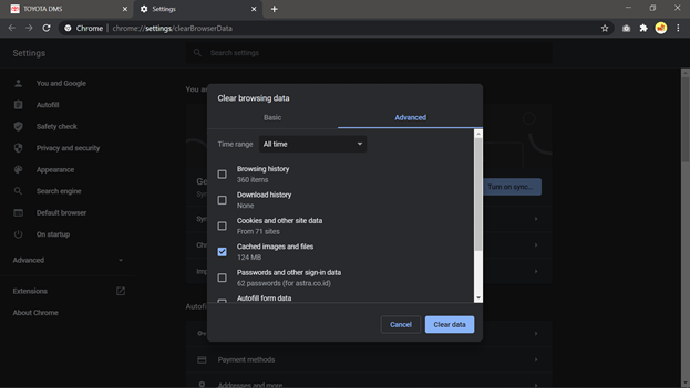untuk melakukan proses clear cached data pada browser Google Chrome. User dapat melihat seperti pada Gambar 4 – Tampilan Clear Browsing Data.