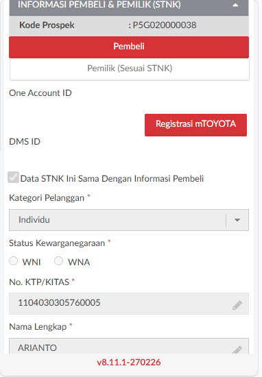 Customer Pengguna adalah Informasi pelanggan yg menggunakan kendaraan sehari-hari (bukan supir). Khusus pengguna hanya ada individu, tidak ada instansi. Data ini tidak mandatory, silahkan diisi apabila sudah bisa didapat. Jika belum bisa dikosongkan. Apabila Sales ingin mengisi data pengguna (yang awalnya blank kemudian diisi) maka silahkan diisi secara setidaknya nama dan HP/NIK agar dikenali sebagai data customer di DMS. Jika salah satu fields tidak diisi maka tidak akan disimpan sebagai customer oleh DMS sehingga data di next proses akan blank.
