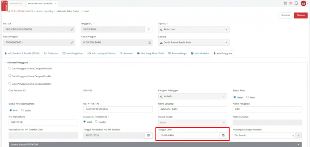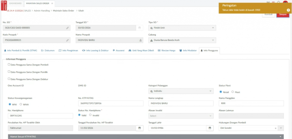 Customer Pengguna adalah Informasi pelanggan yg menggunakan kendaraan sehari-hari (bukan supir). Khusus pengguna hanya ada individu, tidak ada instansi. Data ini tidak mandatory, silahkan diisi apabila sudah bisa didapat. Jika belum bisa dikosongkan. Apabila Sales ingin mengisi data pengguna (yang awalnya blank kemudian diisi) maka silahkan diisi secara setidaknya nama dan HP/NIK agar dikenali sebagai data customer di DMS. Jika salah satu fields tidak diisi maka tidak akan disimpan sebagai customer oleh DMS sehingga data di next proses akan blank.