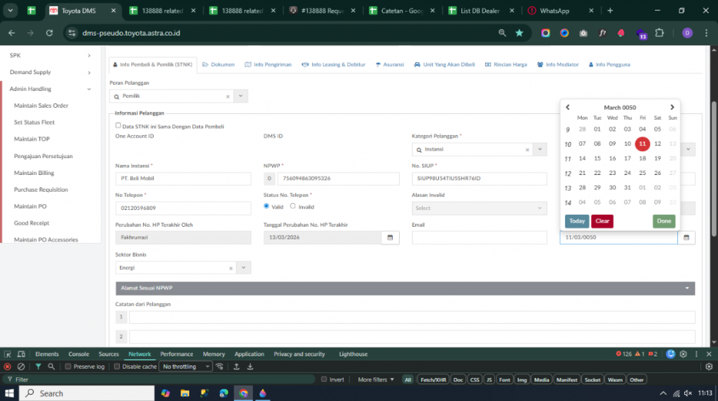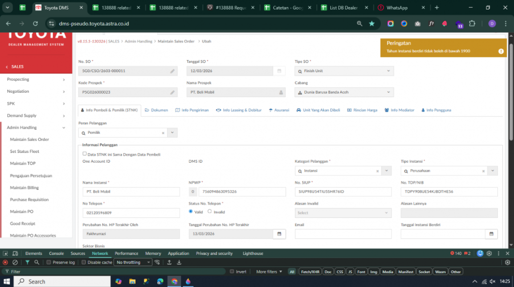 Menambahkan validasi jika tahun lahir (individu) dibawah 1900 dan tahun berdiri (instansi) dibawah 1900 pada Menu List Database (Aju SPK), Daftar Draft SPK, Maintain Sales Order, Maintain Billing