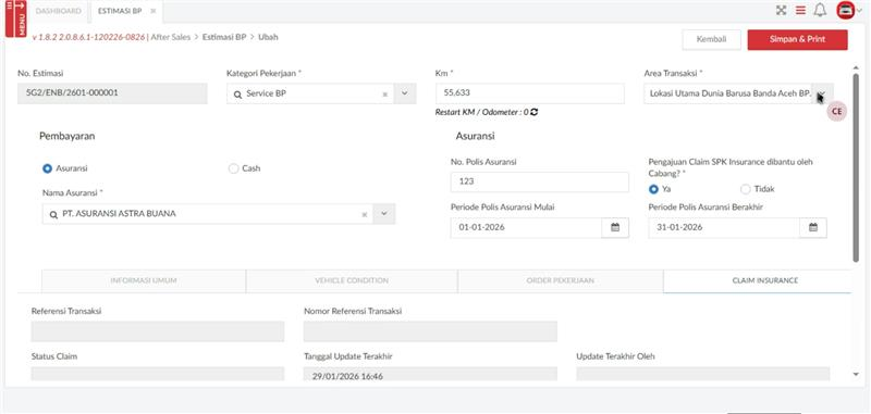 Tampilan View Estimasi untuk informasi terkait No. Estimasi, Kategori Pelanggan, KM kendaraan, Area Transaksi, Pembayaran dan informasi Asuransi hanya untuk lihat dan tidak bisa ubah.