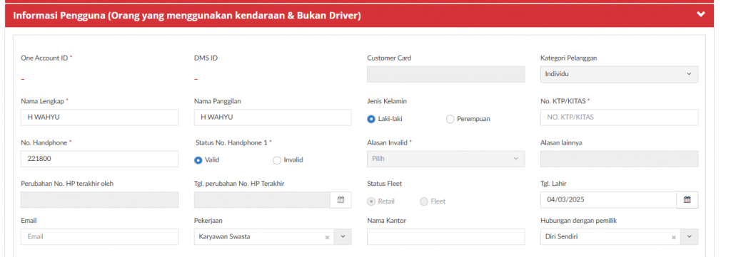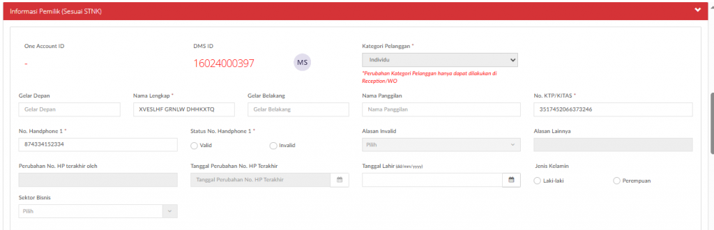- Jika customer tidak memiliki DMS ID maka field tersebut akan terisi “-“