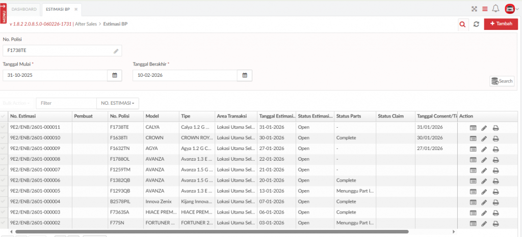 Tampilan View Estimasi untuk informasi terkait No. Estimasi, Kategori Pelanggan, KM kendaraan, Area Transaksi, Pembayaran dan informasi Asuransi hanya untuk lihat dan tidak bisa ubah.