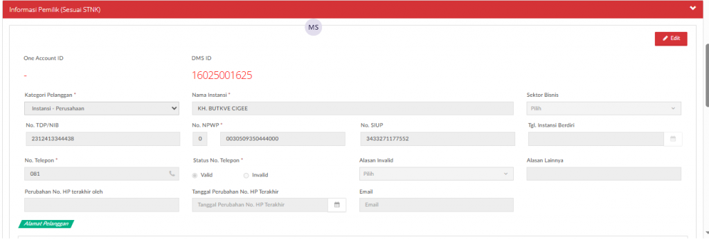 Tombol “Edit” yang dapat digunakan untuk memulai proses input data pemilik berdasarkan informasi pelanggan yang sudah dipilih sebelumnya. Field-field yang bersifat mandatory adalah Kategori Pelanggan, Nama Instansi, No. NPWP, No. Telephone & Status No. Telephone.