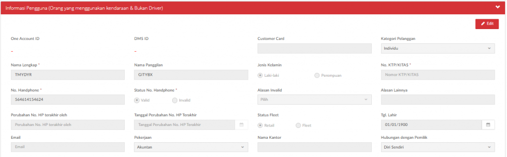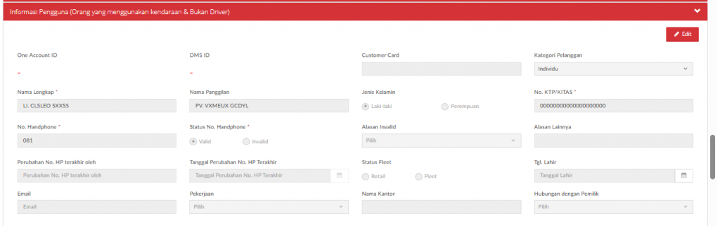 Tombol “Edit” yang dapat digunakan untuk memulai proses input data pengguna atas kendaraan yang akan dibuatkan estimasi tersebut. Field-field yang bersifat mandatory adalah Nama Lengkap, No. KTP/KITAS, No. Handphone dan Status No. Handphone 1.