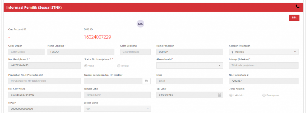Tombol “Edit” yang dapat digunakan untuk memulai proses input data pemilik berdasarkan informasi pelanggan yang sudah dipilih sebelumnya. Field-field yang bersifat mandatory adalah Kategori Pelanggan, Nama Lengkap, No. KTP/KITAS, No. Handphone & Status No. Handphone 1.
