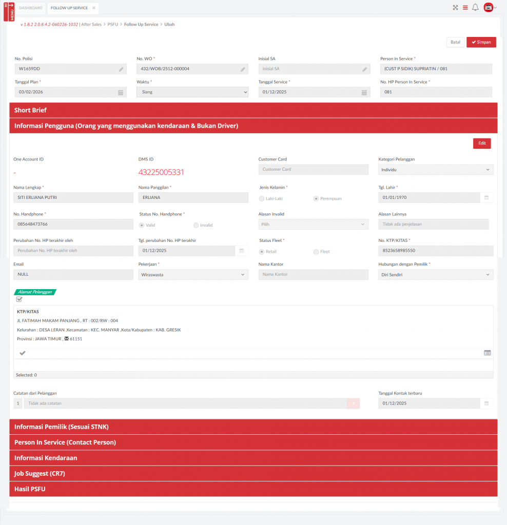setelah icon pensil diklik, maka sistem akan menampilkan detil informasi detil follow up service seperti gambar dibawah ini :