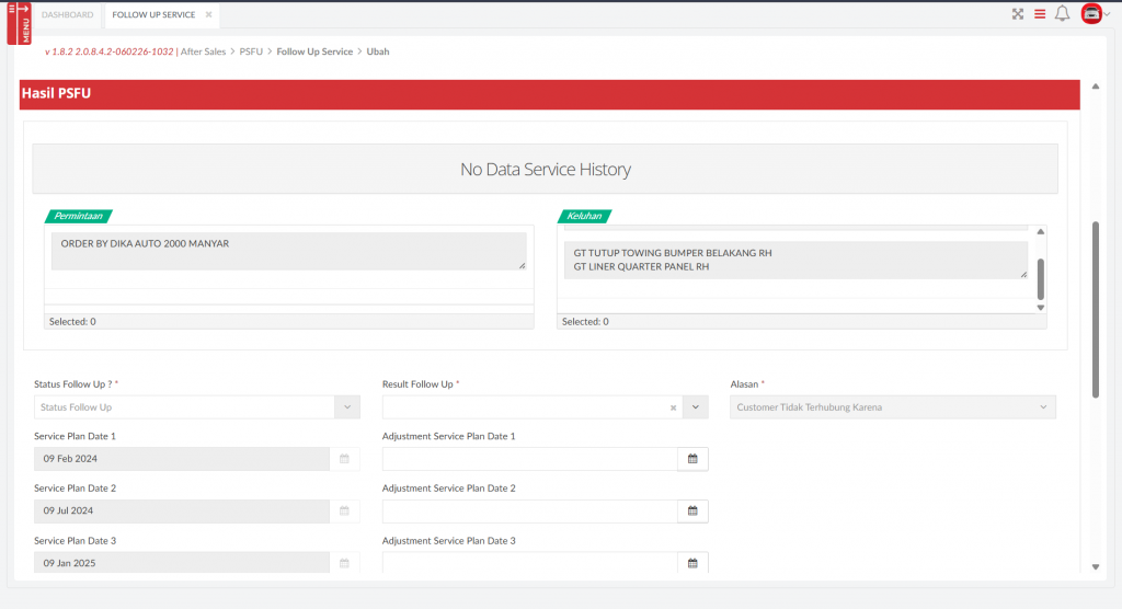 Menu ini dapat diakses oleh role Petugas PSFU melalui After Sales > PSFU > Follow Up Service seperti gambar berikut ini :