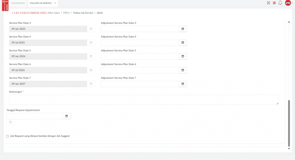 - Jika menginput “Adjustment Service Plan Date (Berdasarkan Request Customer) 1” sampai point 7, maka data akan dialirkan ke Booking Information pada kolom “Suggest Service Selanjutnya (Berdasarkan Request Customer)”