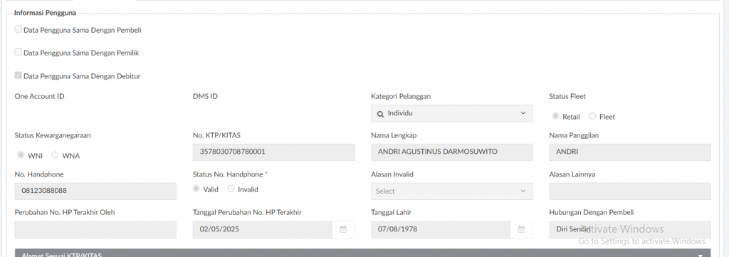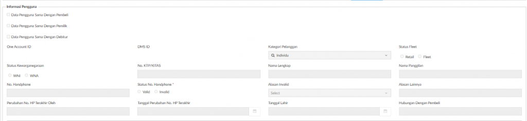 Customer Pengguna adalah Informasi pelanggan yg menggunakan kendaraan sehari-hari (bukan supir). Khusus pengguna hanya ada individu, tidak ada instansi. Data ini tidak mandatory, silahkan diisi apabila sudah bisa didapat. Jika belum bisa dikosongkan. Apabila Sales ingin mengisi data pengguna (yang awalnya blank kemudian diisi) maka silahkan diisi secara setidaknya nama dan HP/NIK agar dikenali sebagai data customer di DMS. Jika salah satu fields tidak diisi maka tidak akan disimpan sebagai customer oleh DMS sehingga data di next proses akan blank.