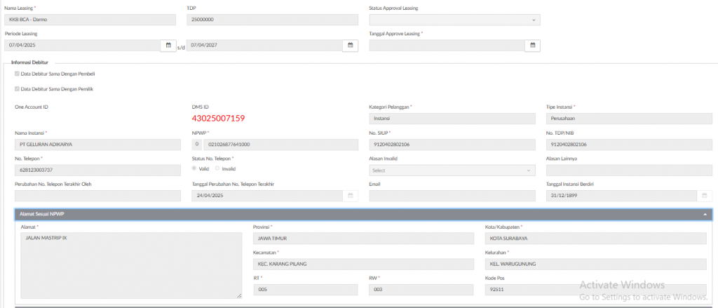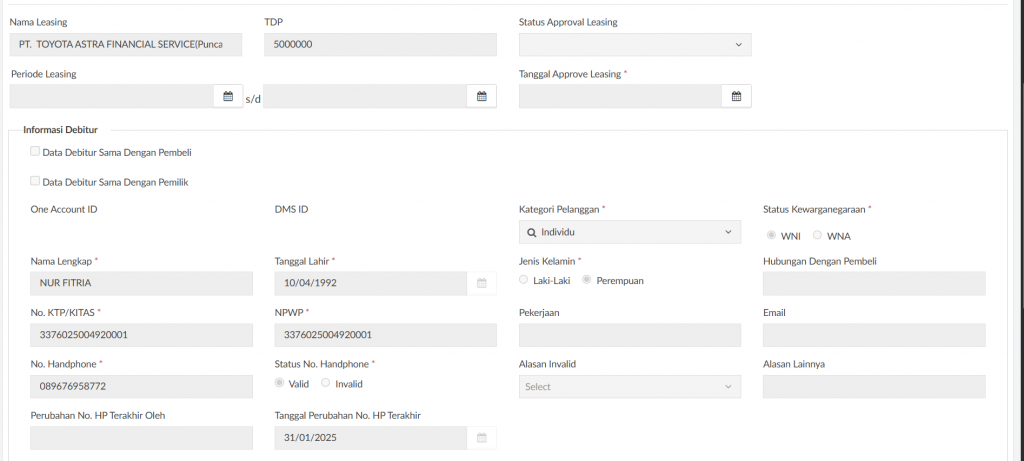 Bagian ini berisi informasi Leasing yang digunakan dan informasi debitur yang akan ditagihkan oleh leasing. customer debitur adalah Informasi pelanggan yg ditagihkan oleh 3rd Party Leasing & Insurance. Bisa berupa individu ataupun instansi. Data- data ini wajib diisi ketika sumber dana credit