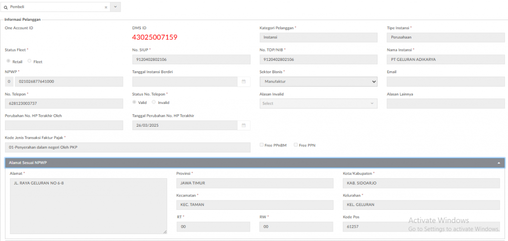 Customer Pembeli adalah Informasi pelanggan yang tertera sebagai pemesan/pembeli di SPK. Bisa berupa individu ataupun instansi. Data Pembeli tidak bisa diedit, mengikuti requirement eksisting DMS. Jika ada perubahan silahkan diedit di SPK.
