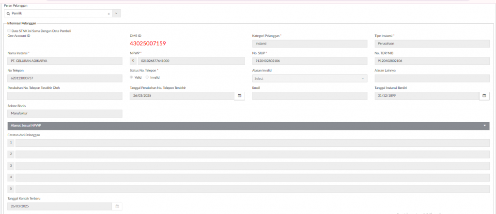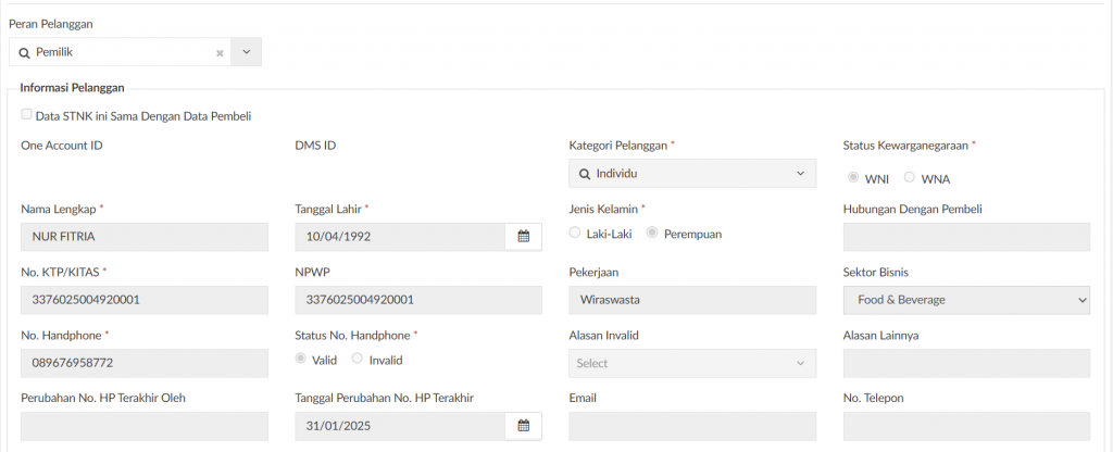 Customer Pemilik adalah Informasi pelanggan sesuai dokumen STNK. Bisa berupa individu ataupun instansi. Data Pemilik bisa diedit.