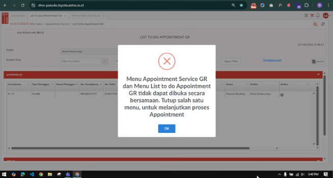 Validasi ini bertujuan agar Menu Appointment Service dan Menu List to do Appointment tidak dapat dibuka secara bersamaan, sehingga jika dibuka bersamaan maka akan muncul pesan seperti gambar berikut :