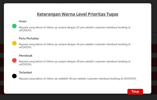 - Link Penjelasan Level ; akan menampilkan pop up yang berisi keterangan warna level prioritas tugas