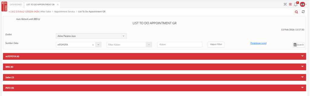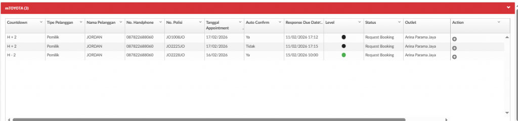 Menu ini juga digunakan oleh Kepala Bengkel untuk melakukan monitoring terkait aktifitas permintaan booking service dari mTOYOTA dan aktifitas service berkala dari MRS, SALES dan PSFU dengan akses yang diberikan terbatas hanya melihat tanpa melakukan perubahan data.