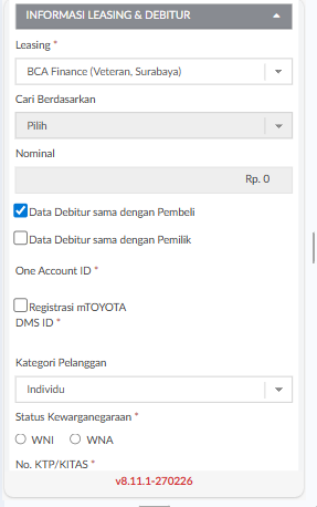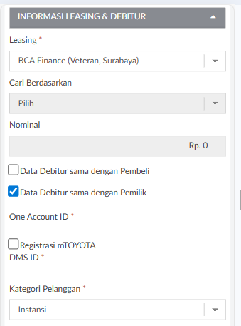 Customer Debitur adalah Informasi pelanggan yg ditagihkan oleh 3rd Party Leasing & Insurance. Bisa berupa individu ataupun instansi. Data- data ini wajib diisi ketika sumber dana credit