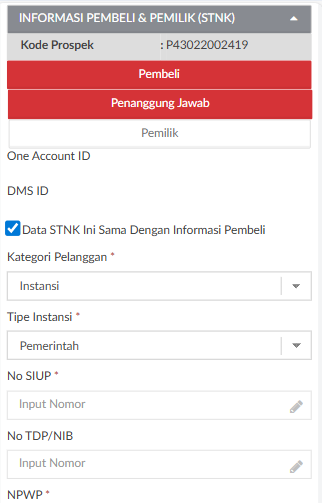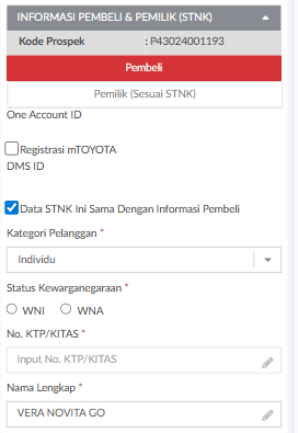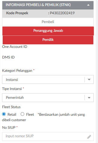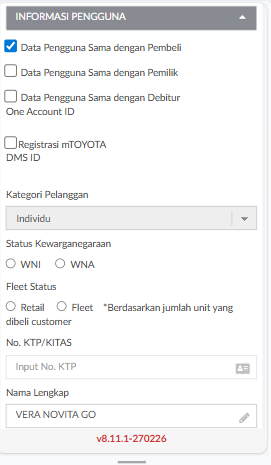 Customer Pengguna adalah Informasi pelanggan yg menggunakan kendaraan sehari-hari (bukan supir). Khusus pengguna hanya ada individu, tidak ada instansi. Data ini tidak mandatory, silahkan diisi apabila sudah bisa didapat. Jika belum bisa dikosongkan. Apabila Sales ingin mengisi data pengguna (yang awalnya blank kemudian diisi) maka silahkan diisi secara setidaknya nama dan HP/NIK agar dikenali sebagai data customer di DMS. Jika salah satu fields tidak diisi maka tidak akan disimpan sebagai customer oleh DMS sehingga data di next proses akan blank.