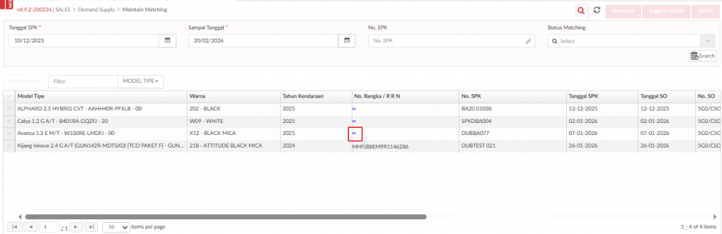 Berikut menu Maintain Matching yang dapat diakses melalui Sales>Demand Supply > Maintain Matching. Fitur ini digunakan untuk memasangkan atau melepaskan No Rangka/RRN ke salah satu SPK atau Sales Order yang sudah dibuat seperti pada Gambar 56 – Maintain Matching. Memasangkan No Rangka/RRN dapat dilakukan dengan 2 cara yaitu berdasarkan saran dari sistem secara otomatis atau manual yang dilakukan oleh User.