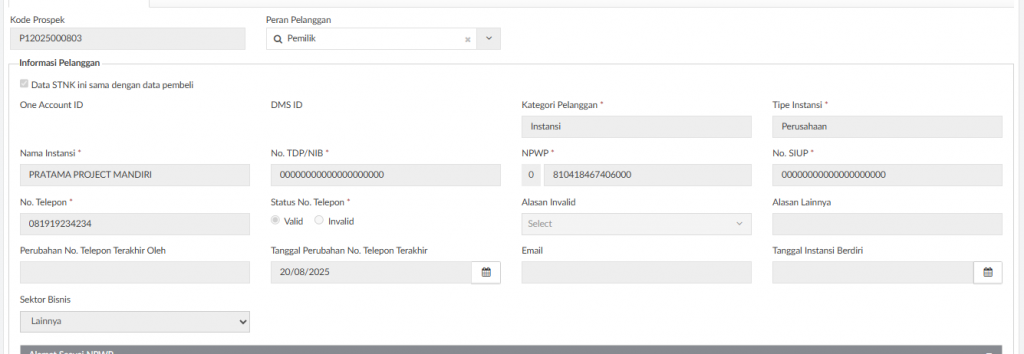 Customer Pemilik adalah Informasi pelanggan sesuai dokumen STNK. Bisa berupa individu ataupun instansi.