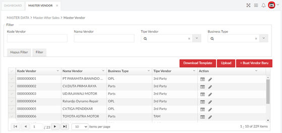 Berikut merupakan Menu Master Vendor, Menu ini menampilkan List Vendor. Semua data yang tertampil pada datagrid ini merupakan data yang dicari oleh user. Menu ini dapat di akses Master Data -> Master After Sales -> Master Vendor.