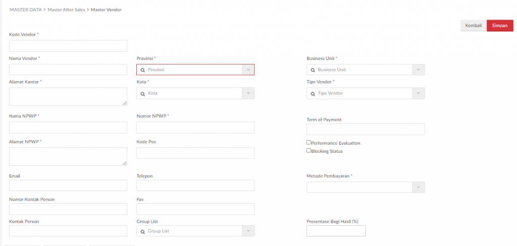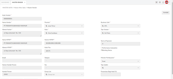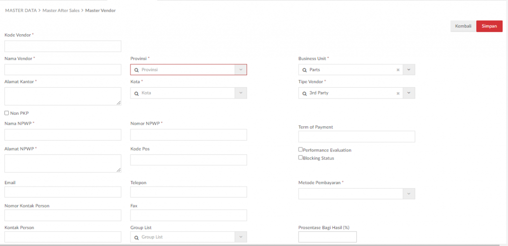 Untuk vendor dengan business type Parts dan tipe vendornya 3rd party, tampilan isiannya akan seperti gambar berikut ini :