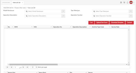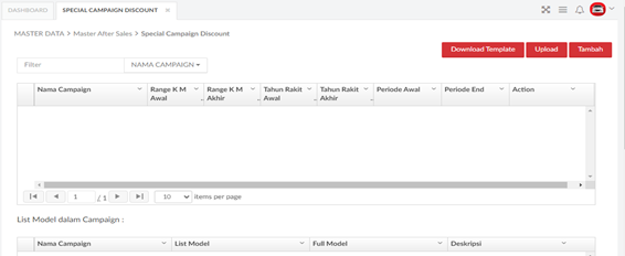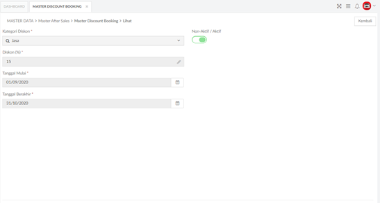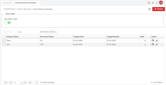 Master Discount Booking digunakan oleh Admin Service untuk setting master discount booking. Menu ini dapat di akses Master Data -> Master After Sales -> Master Discount Booking