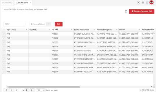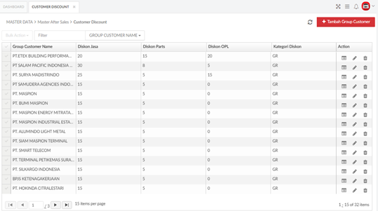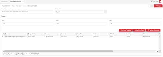 Fitur ini digunakan Admin Service untuk pengaturan terhadap Master Customer Discount. Customer Discount di kelompokan ke dalam Group Customer, setelah itu di data list Customer Discount, Setiap discount yang ada mengikat kepada Group Customer. Menu ini dapat di akses Master Data -> Master After Sales -> Customer Discount.