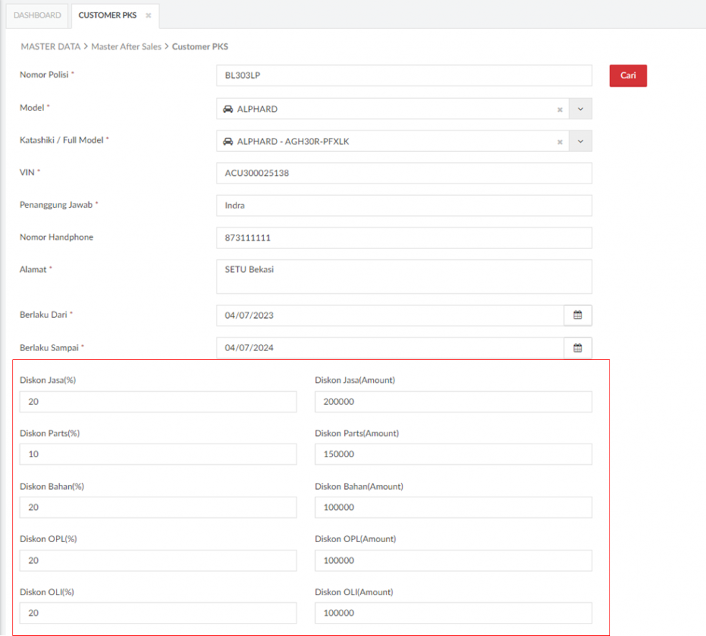 - Kategori Diskon : Kategori diskon sesuai outlet GR atau BP.