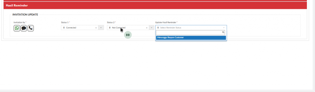 • Not Contacted: Jika customer di hubungi melalui telepon diangkat, jika dihubungi melalui WA customer tidak membalas / merespon Jika memilih “Not Contacted” akan menampilkan field “Update Hasil Reminder”