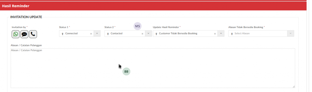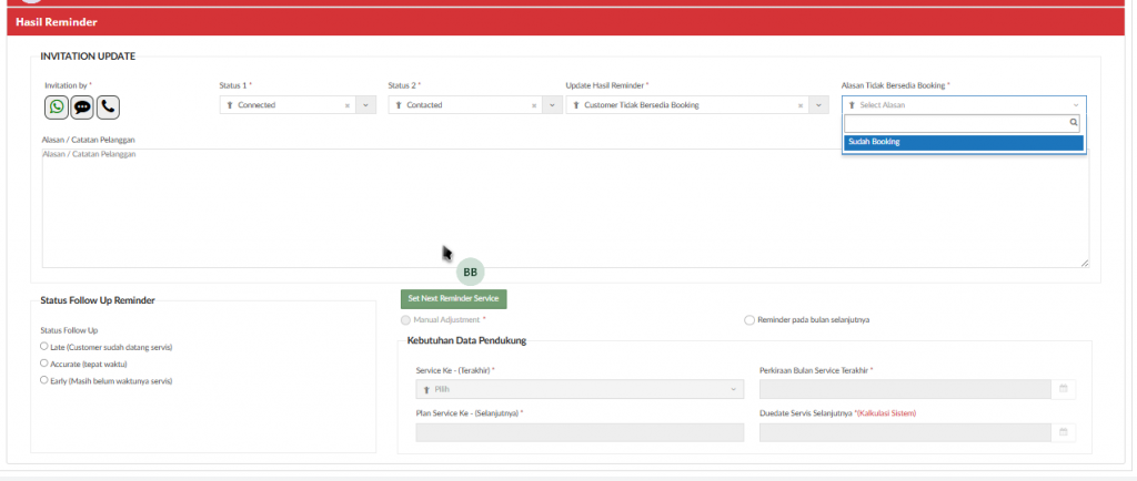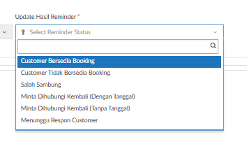 Jika memilih Hasil Reminder “Customer Tidak Bersedia Booking” maka akan menampilkan field “Alasan Tidak Bersedia Booking “