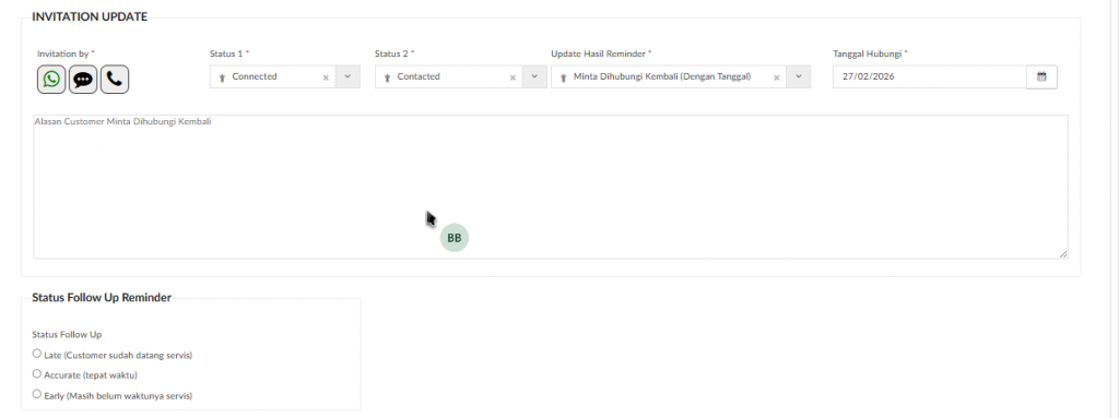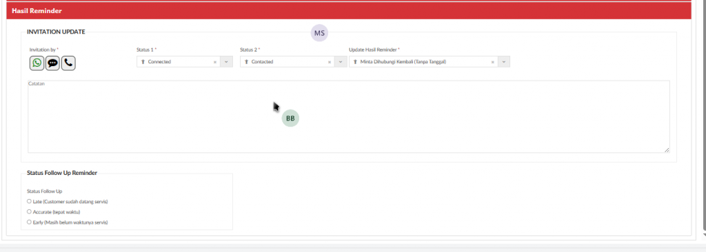 Jika memilih Hasil Reminder “Sudah Service” maka akan menampilkan field “Catatan“ dan detail informasi service yang sudah dilakukan pelanggan