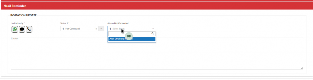 Jika memilih Hasil Reminder “Salah Sambung” maka akan menampilkan field “Catatan “