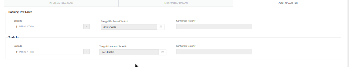 Additional Offer tersimpan pada data kendaraan dan akan ter-suggest sesuai value terakhir update pada setiap pembuatan transaksi. Silahkan cek DEC Date pada Tab Free Claim. Jika sudah > 30 bulan maka silahkan tawarkan additional offer test drive dan trade-in. Fields ini belum terhubung langsung ke DMS bagian sales sehingga silahkan infokan secara operation untuk koordinasi lebih lanjut. Fields ini akan dialirkan juga ke proses setelahnya di aftersales (appointment dan reception) untuk direkonfirmasi ulang oleh setiap PIC.
