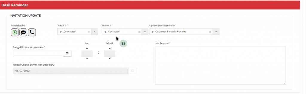 Jika memilih Hasil Reminder “Customer Bersedia Booking” maka akan menampilkan field “Tanggal Request Appointment “