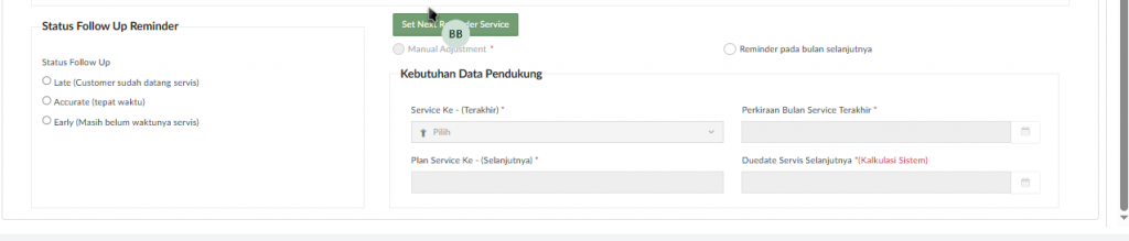 Menampilkan tipe reminder service antara lain : SBI, SBE, GR, FA, Pasif, dan Other