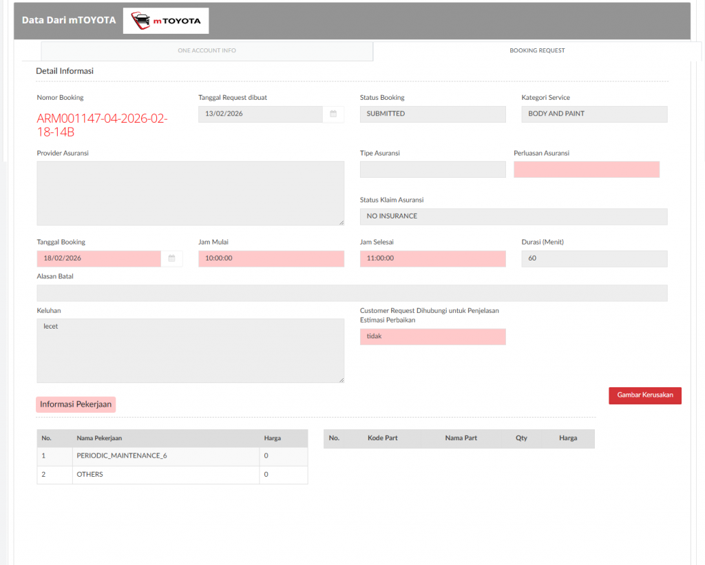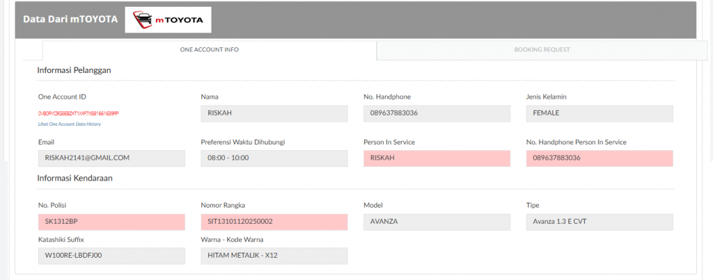 - jika sumber data berasal selain dari mTOYOTA tidak akan menampilkan informasi pelanggan serta detil request booking dari mTOYOTA