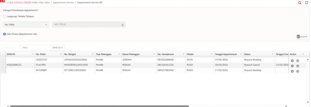 Merupakan kategori permintaan appointment servis baik dari pelanggan yang datang langsung ke cabang untuk booking atau melalui telepon. Pada proses ini petugas harus memasukan No. Polisi atau Toyota ID untuk dilakukan pengecekan terhadap data pelanggan.
