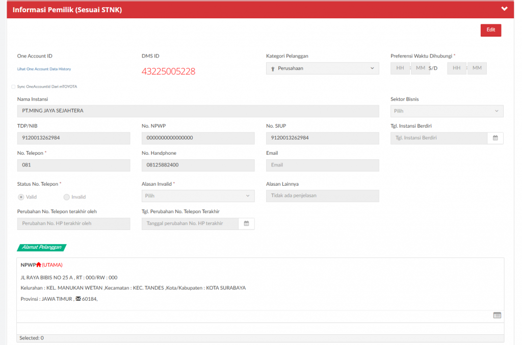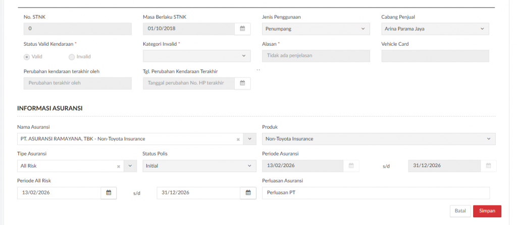 Setelah klik button “Edit” maka akan mengaktifkan beberapa field pada Informasi Pemilik, Alamat, Catatan dari Pelanggan, Informasi Kendaraan, dan Informasi Asuransi.