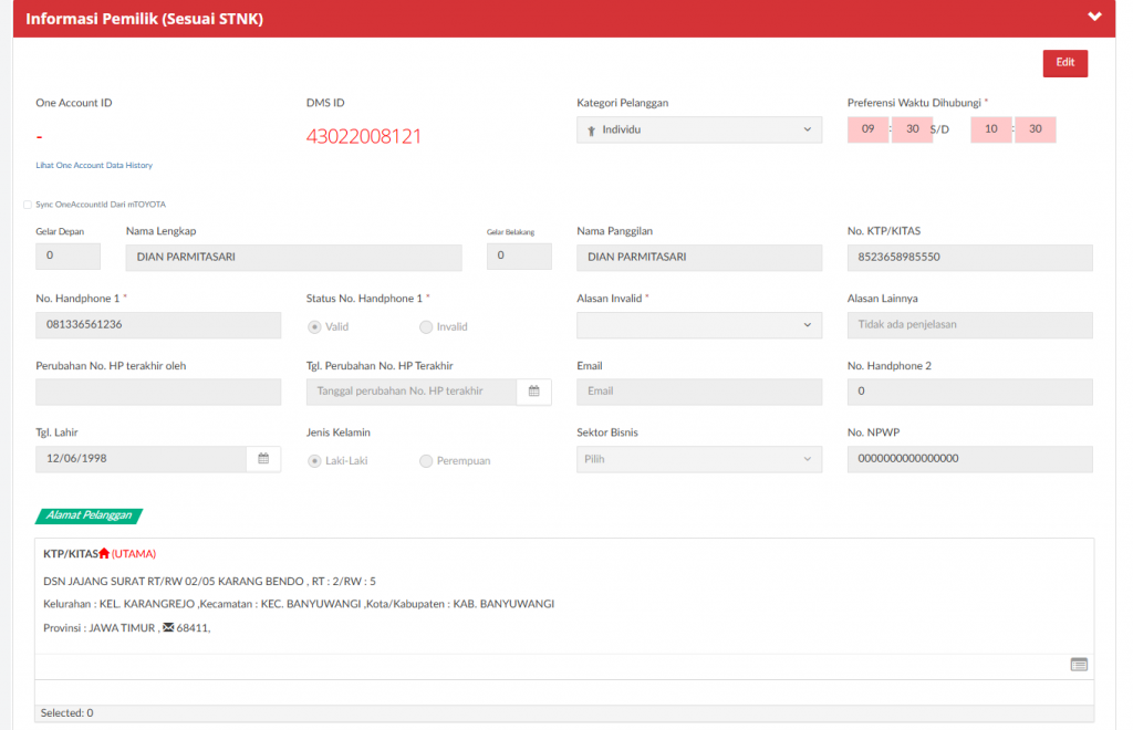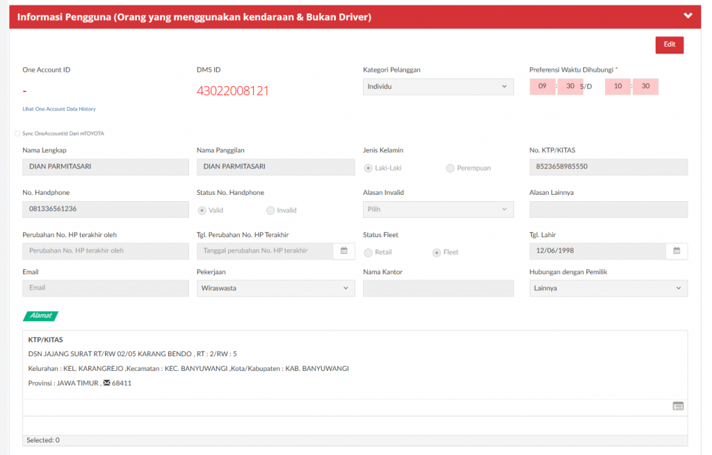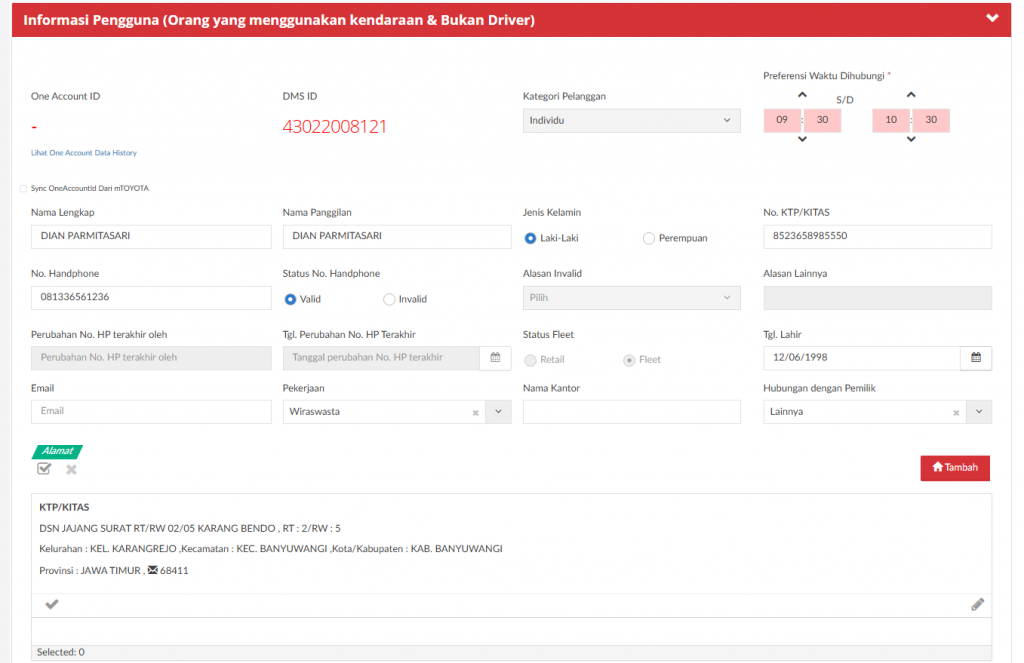 Data ini tidak mandatory, silahkan diisi apabila sudah bisa didapat. Jika belum bisa didapat dikosongkan saja (tidak perlu klik Edit Data Pengguna). Apabila MRA ingin mengisi data pengguna (yang awalnya blank kemudian diisi) maka silahkan diisi secara setidaknya nama dan HP/NIK agar dikenali sebagai data customer di DMS. Jika salah satu fields tidak diisi maka tidak akan disimpan sebagai customer oleh DMS sehingga data di next proses akan blank. Apabila MRA ingin mengedit data (pengguna tetap sama, namun ada beberapa data yang ingin direvisi) dipersilahkan untuk diedit di menu ini.