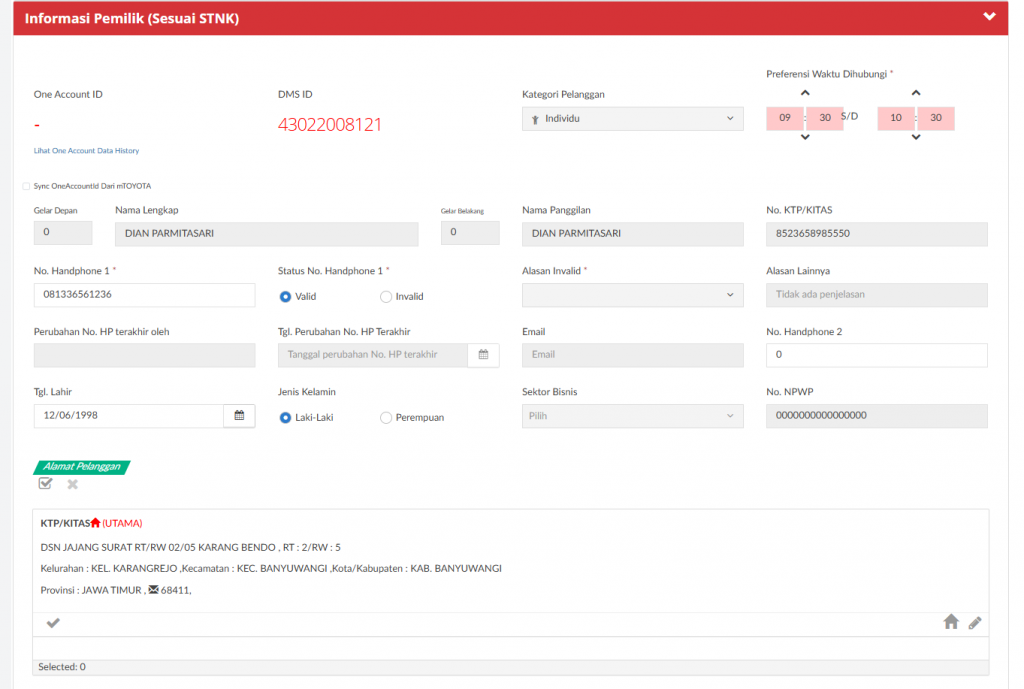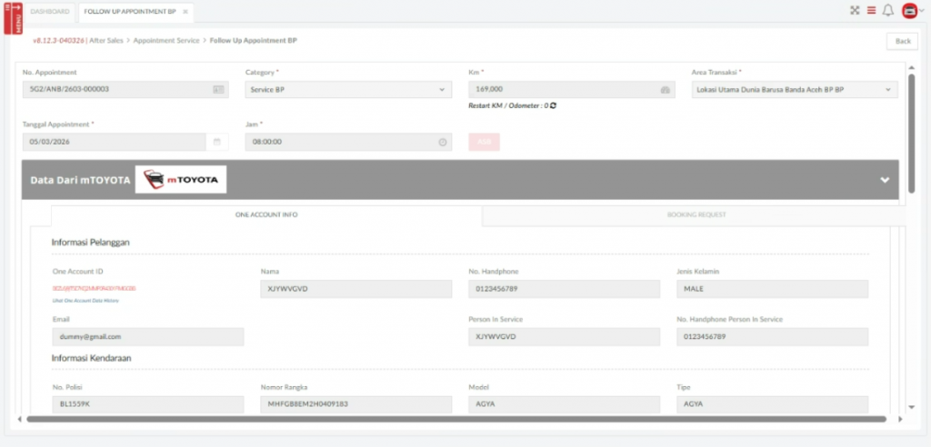 - jika sumber data berasal dari mTOYOTA dan kendaraan terdaftar di DMS akan menampilkan informasi pelanggan serta detail request booking dari mTOYOTA dan menampilkan informasi pelanggan dan kendaraan terdaftar dari DMS