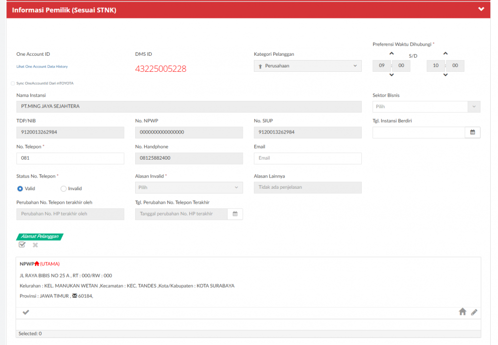 – Data Mandatory pada Pemilik: Nama Lengkap, Status Kewarganegaraan, No.KTP/KITAS, Status KTP/KITAS, No. Handphone 1, Status No. Handphone 1, No. NPWP, Status Customer Consent