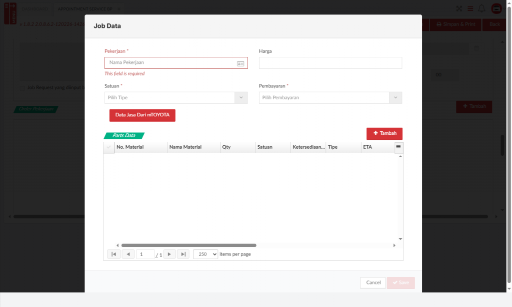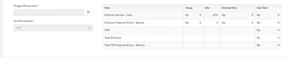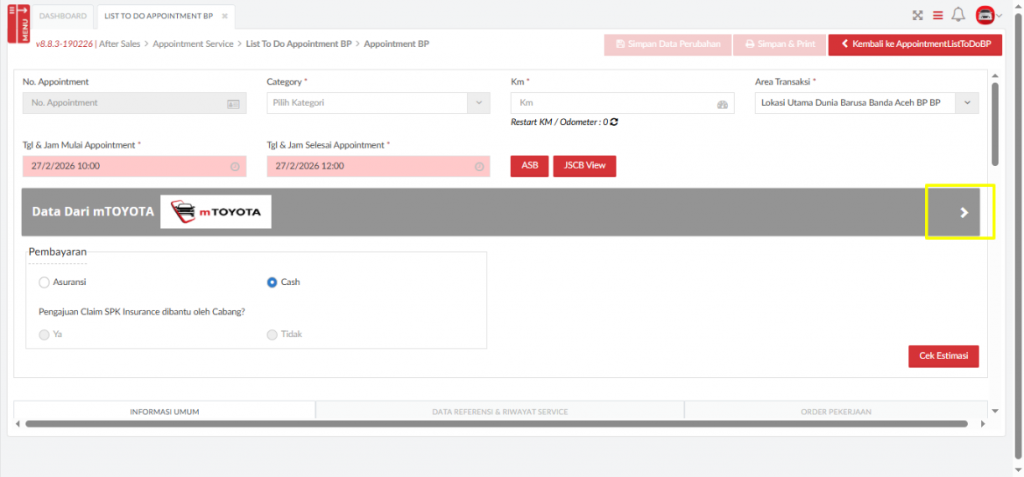 Tombol Cek Estimasi digunakan jika data appointment akan menggunakan data estimasi service yang sudah dibuat sebelumnya.