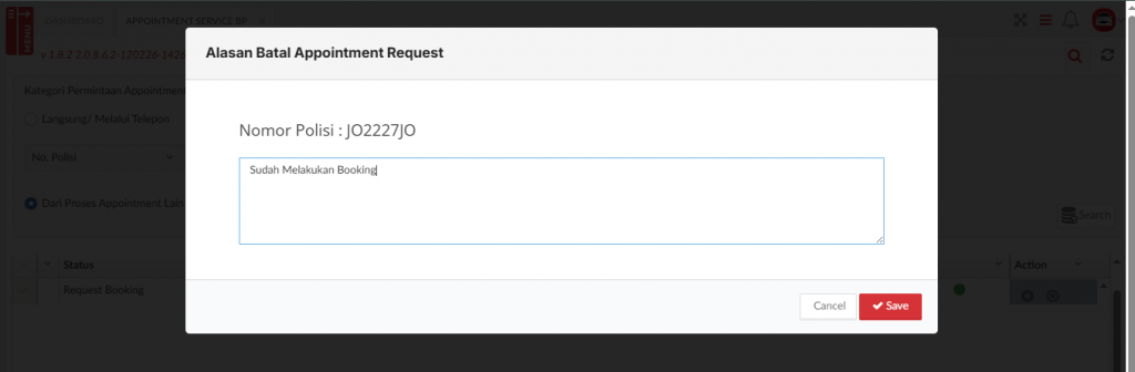 Saat klik tombol SAVE untuk membatalkan Appoinment ;