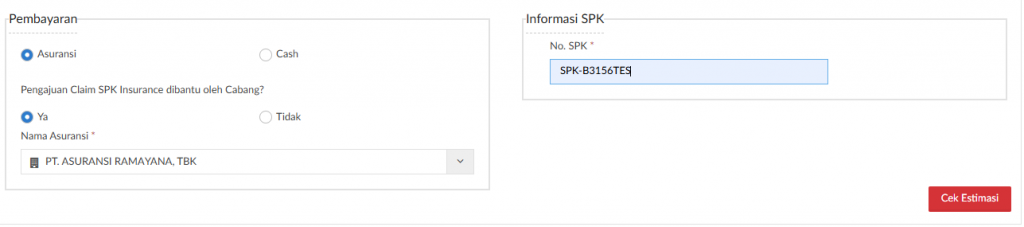 Jika customer akan melakukan pembayaran dengan melalui pihak asuransi. Terdapat beberapa data pendukung yang harus diisi seperti : Nama Asuransi dan Nomor SPK.