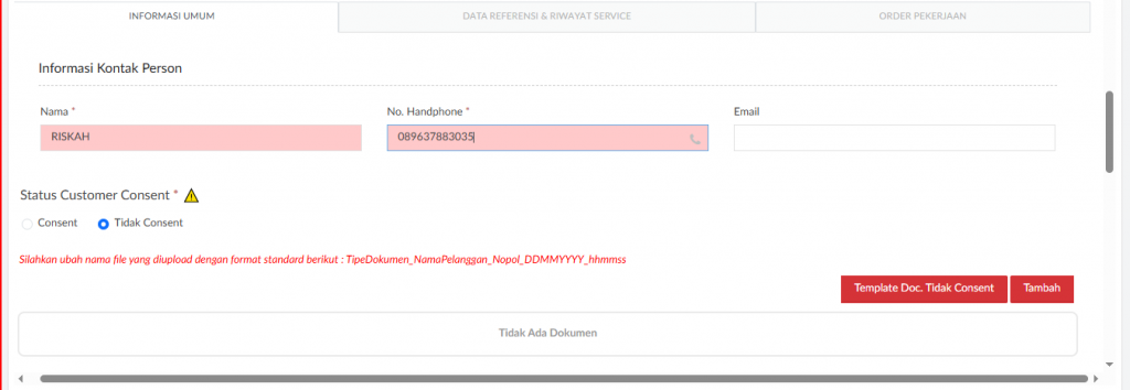 Tampilan ini dapat digunakan untuk menginput data kontak person / PIC jika terdapat sesuatu hal yang perlu dikonfirmasi terkait dengan pekerjaan service.