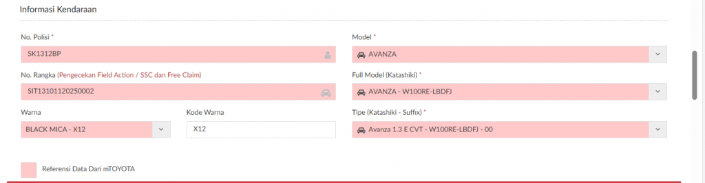 Untuk Pemilik yang sudah memiliki Toyota ID, data Pemilik dan kendaraan akan terisi otomatis mengikuti data yang disimpan pada Toyota ID. Sedangkan Pemilik yang tidak memiliki Toyota ID, maka SA diharuskan mengisikan data informasi kendaraan.
