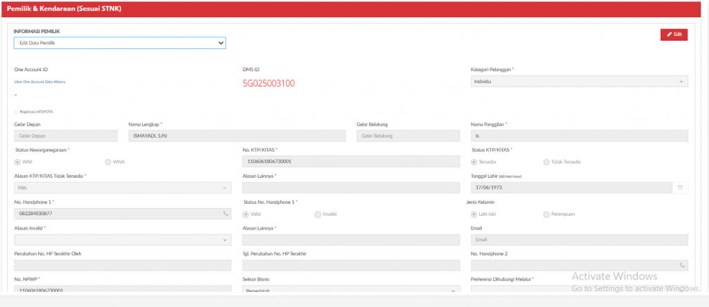 Customer Pemilik adalah Informasi pelanggan sesuai dokumen STNK. Bisa berupa individu ataupun instansi. Data Pemilik bisa diedit. Proses perubahan data pemilik hanya bisa dilakukan secara minor. Pemilik as is namun ada fields yang ingin diubah (contoh ada pergantian no. HP). Apabila secara pemilik berubah, seperti contoh dari A ke B, maka secara sistem tidak diperbolehkan. Perubahan seperti itu hanya bisa dilakukan di reception karena evidence yang didapat lebih valid.
