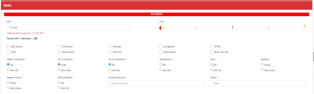 Pada tampilan WAC bisa dilihat detail dari hasil WAC yang sudah dilakukan oleh SA meliputi km terakhir, informasi fuel, dan kondisi mobil seperti berikut: