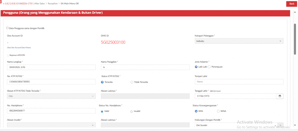 Untuk Pemilik yang sudah memiliki Toyota ID, data Pemilik dan kendaraan akan terisi otomatis mengikuti data yang disimpan pada Toyota ID. Sedangkan Pemilik yang tidak memiliki Toyota ID, maka SA diharuskan mengisikan data informasi kendaraan.